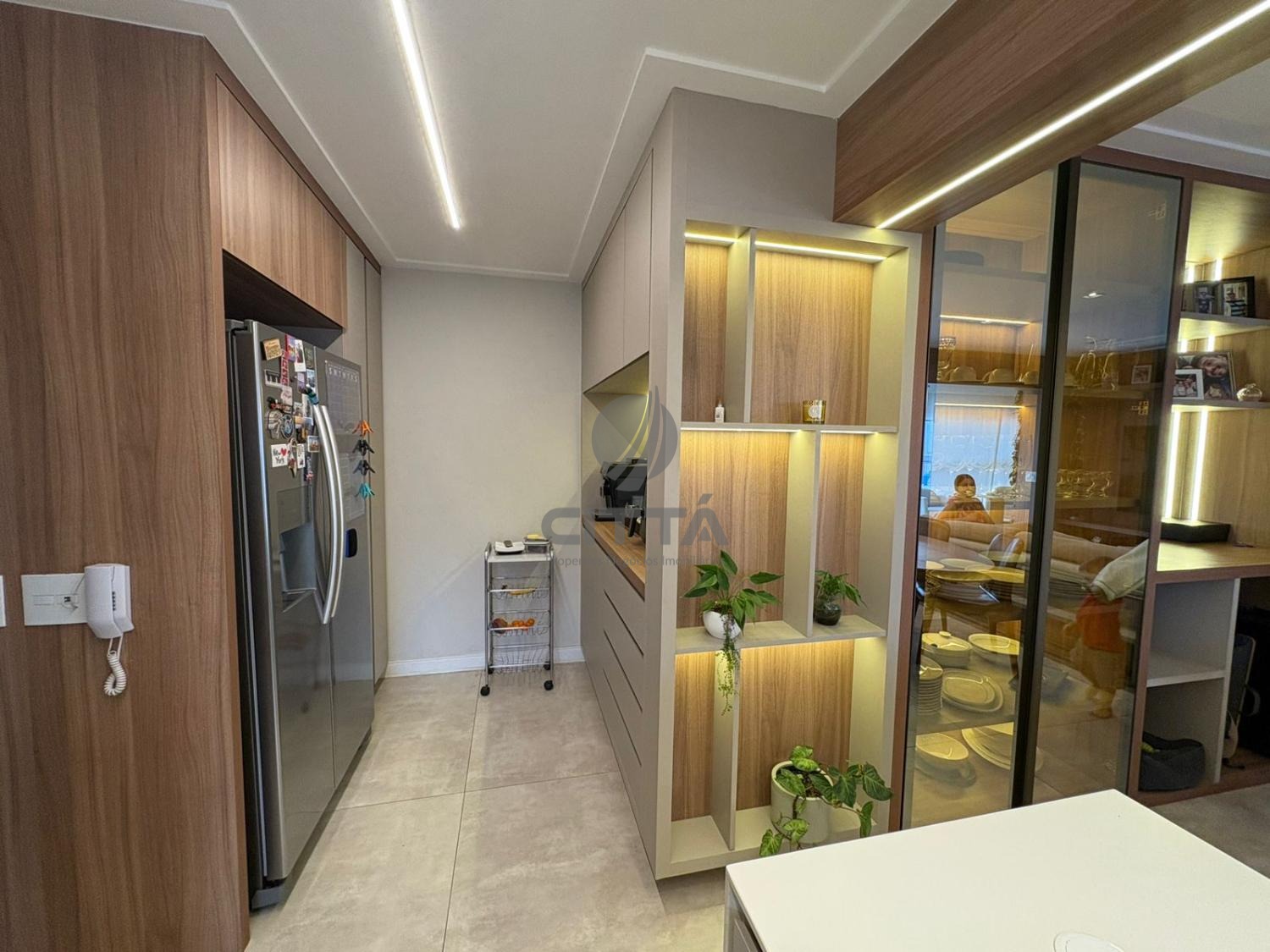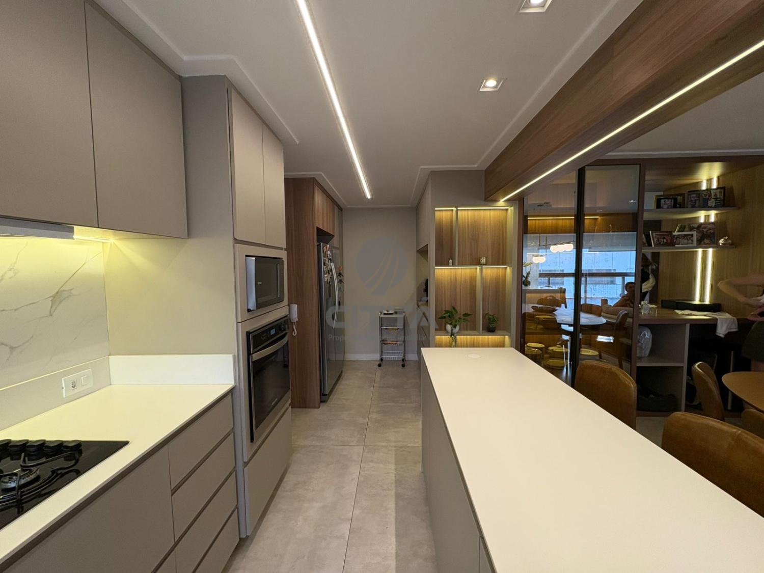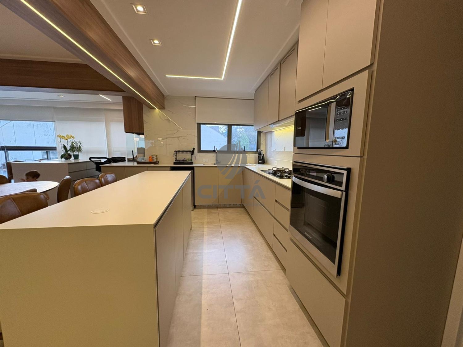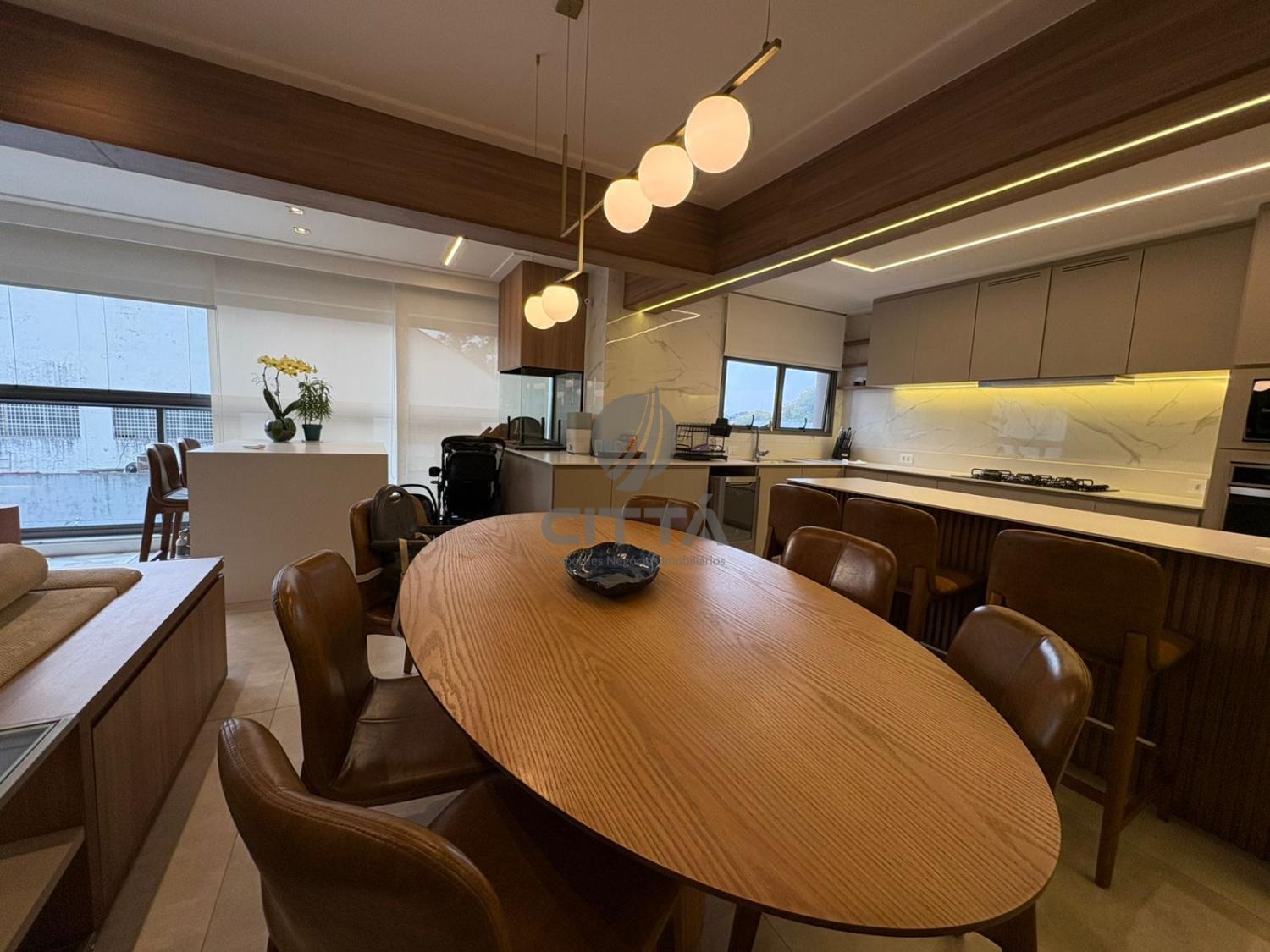 A cozinha, totalmente planejada e equipada, alia praticidade e sofisticação, acompanhada por lavanderia e banheiro de serviço.