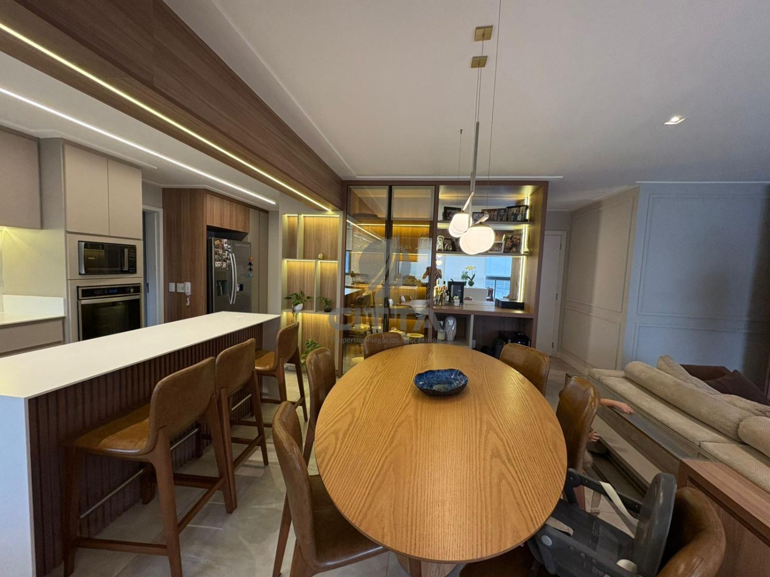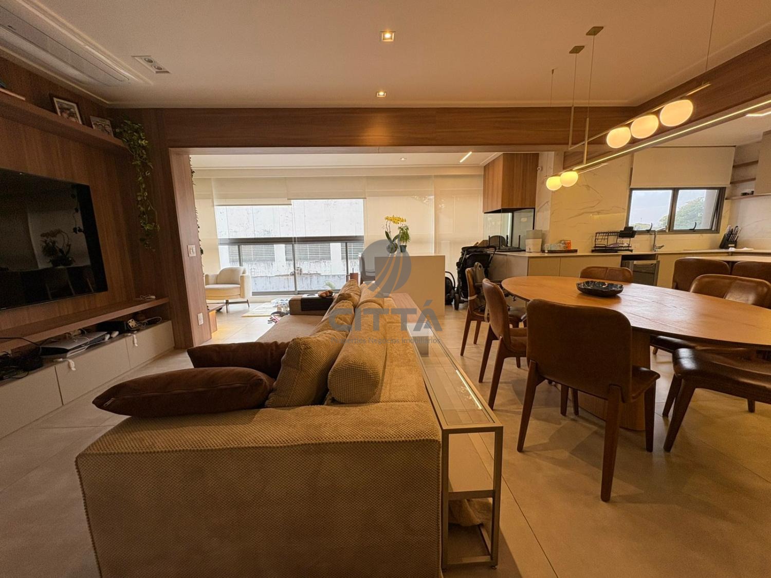 O amplo living integra-se de forma harmoniosa à varanda gourmet, criando um ambiente acolhedor e perfeito para receber amigos e viver momentos especiais.