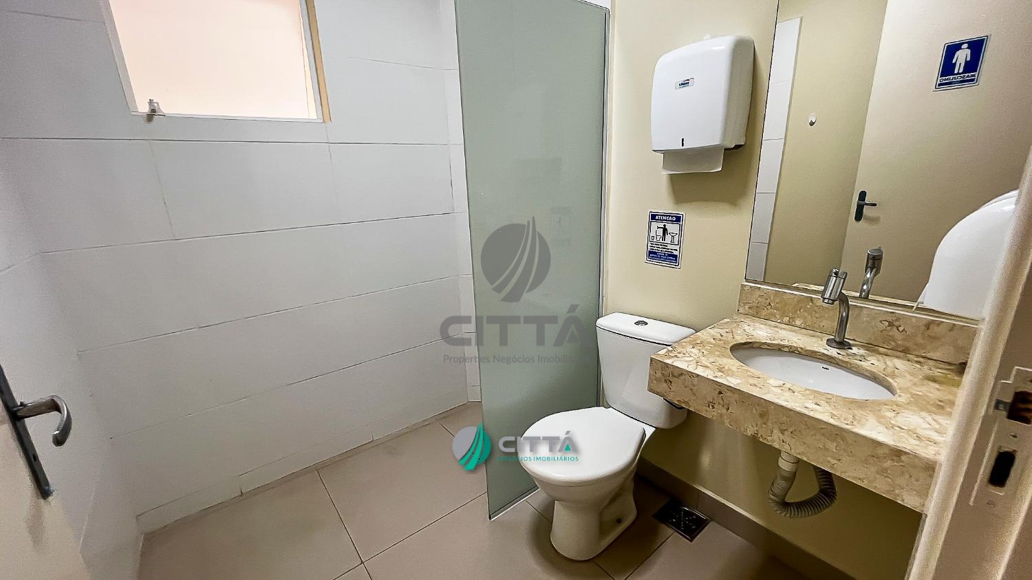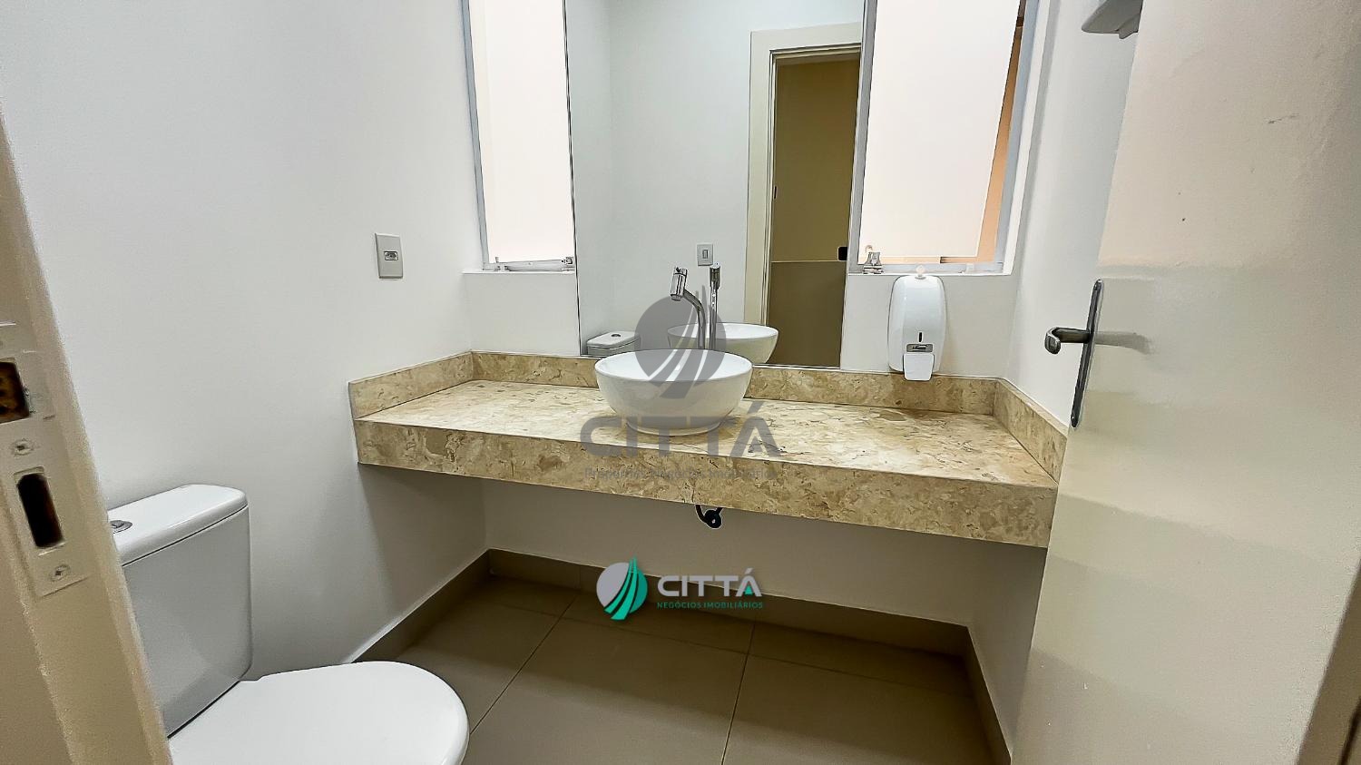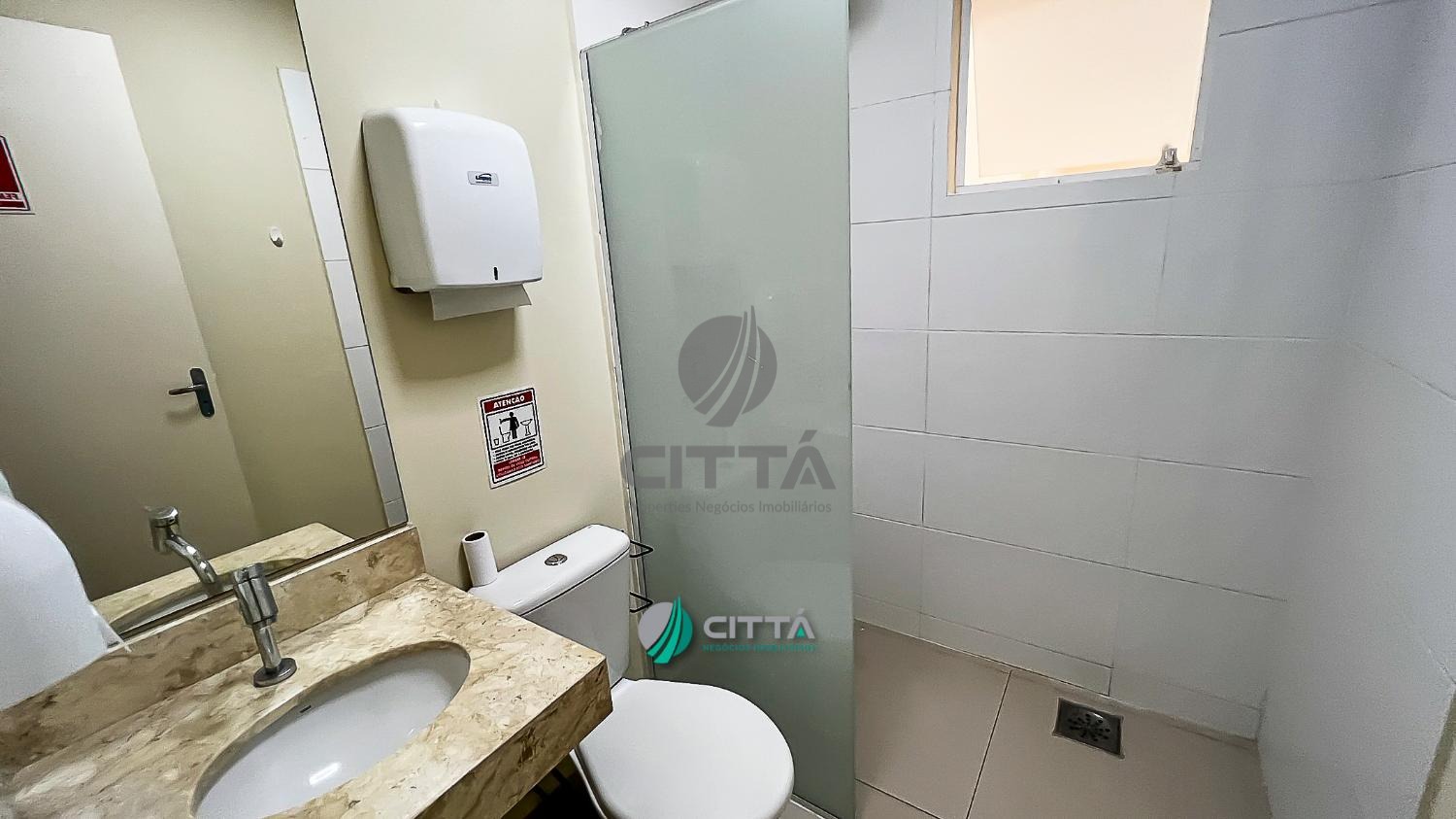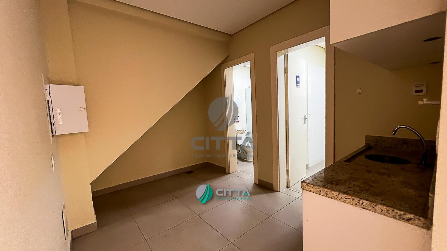 Recepção com piso porcelanato, escada para acesso ao mezanino em mármore travertino, copa, 2 banheiros com chuveiro, espelho e pia.