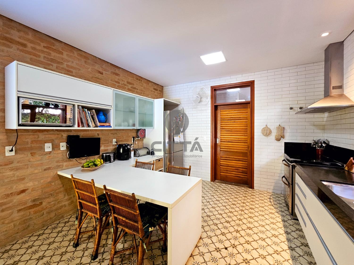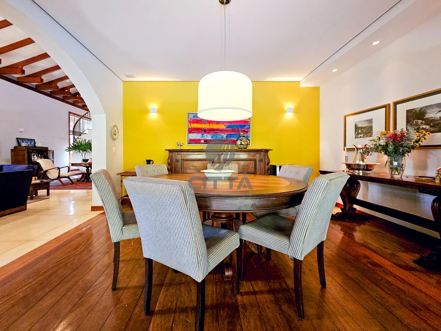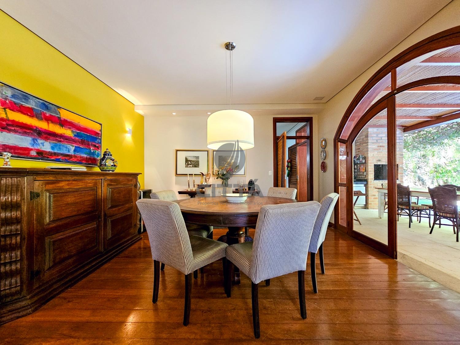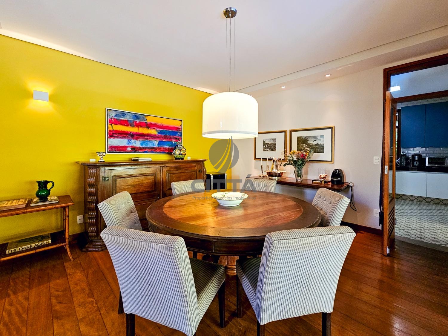 Elegante sala de jantar que se conecta a uma cozinha espaçosa, equipada para quem gosta de cozinhar e receber.