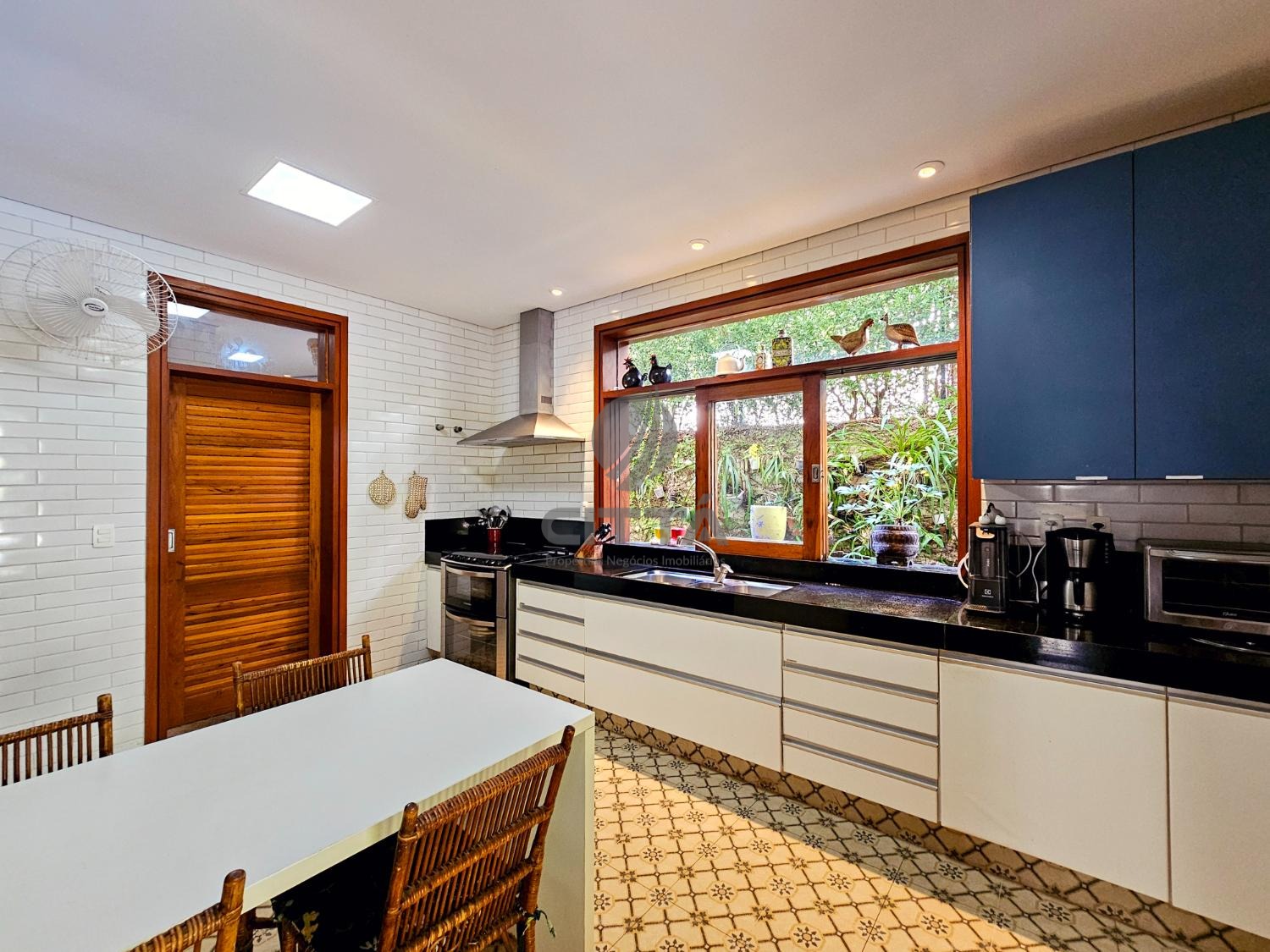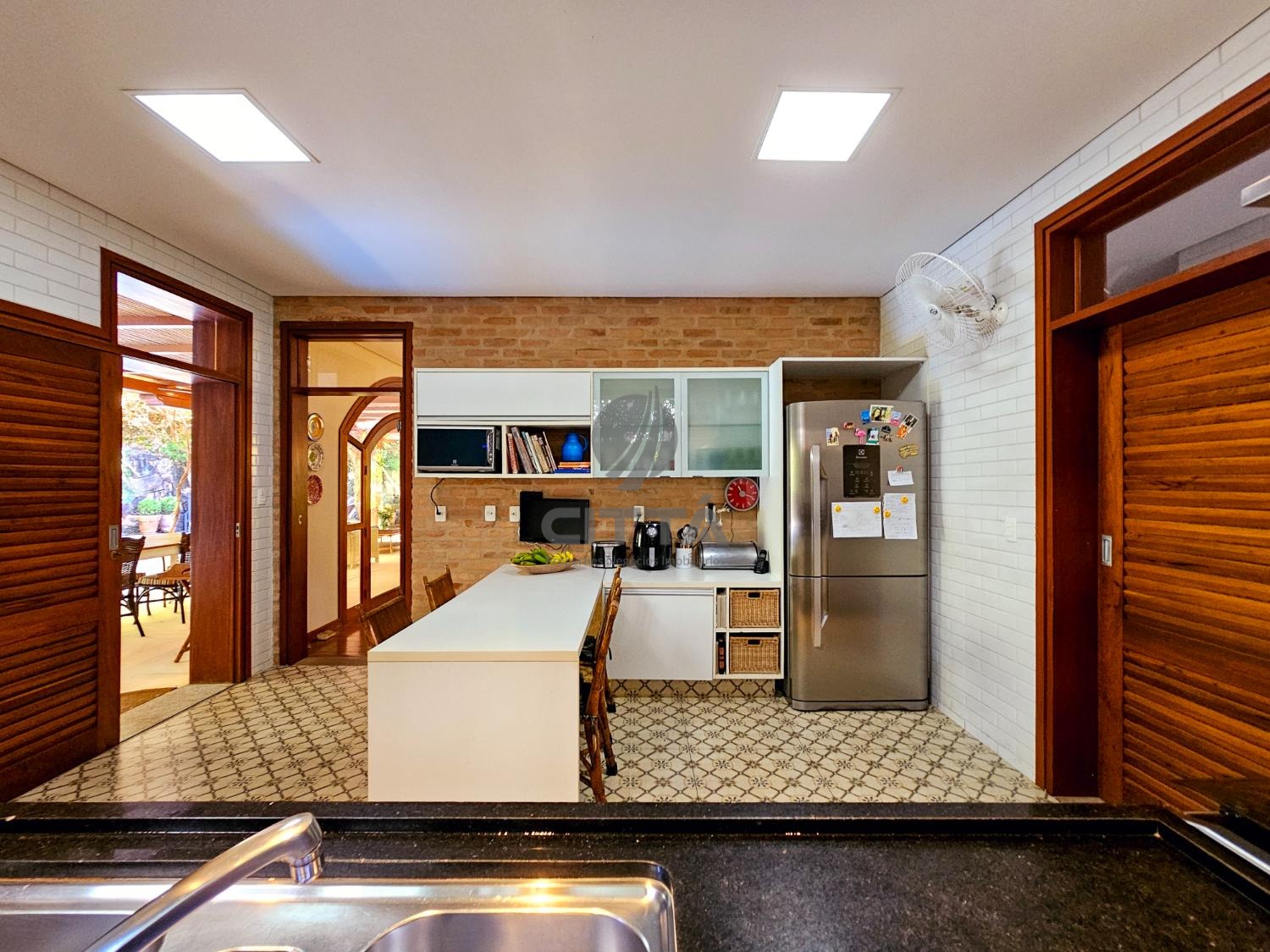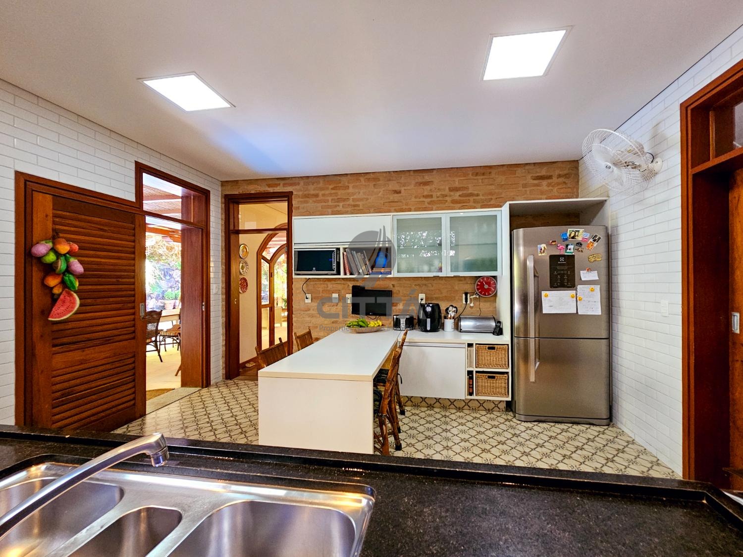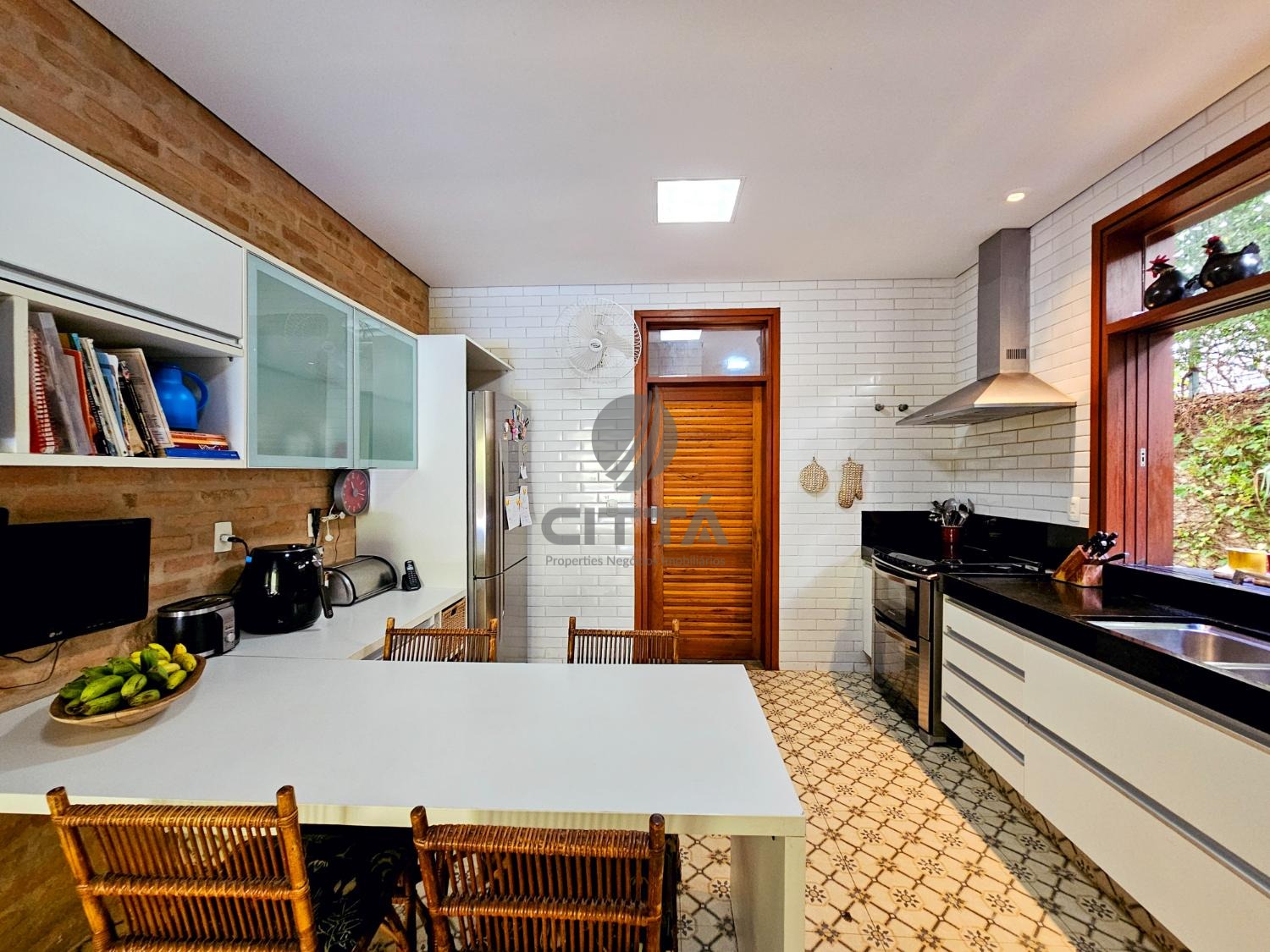 Elegante sala de jantar que se conecta a uma cozinha espaçosa, equipada para quem gosta de cozinhar e receber.