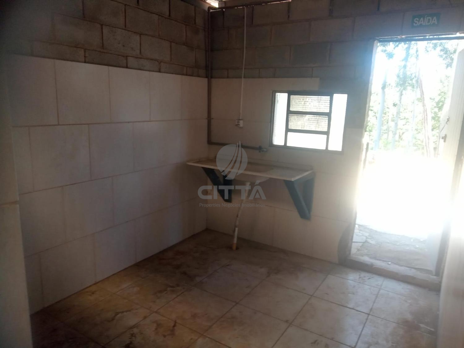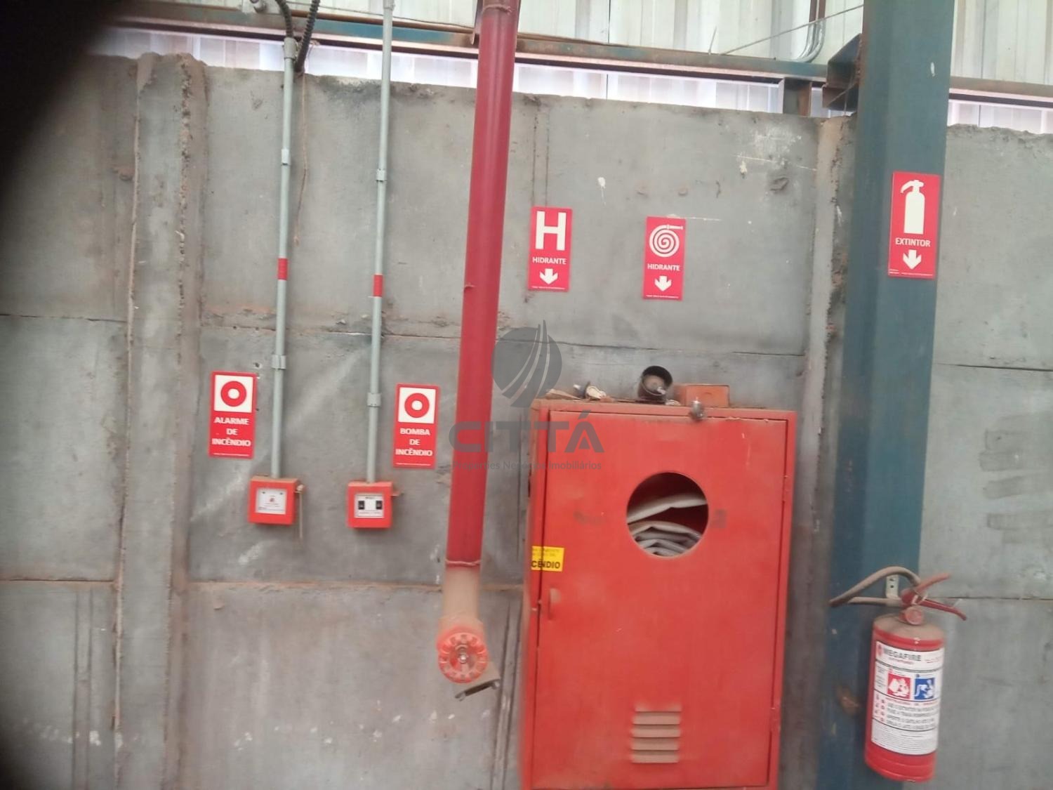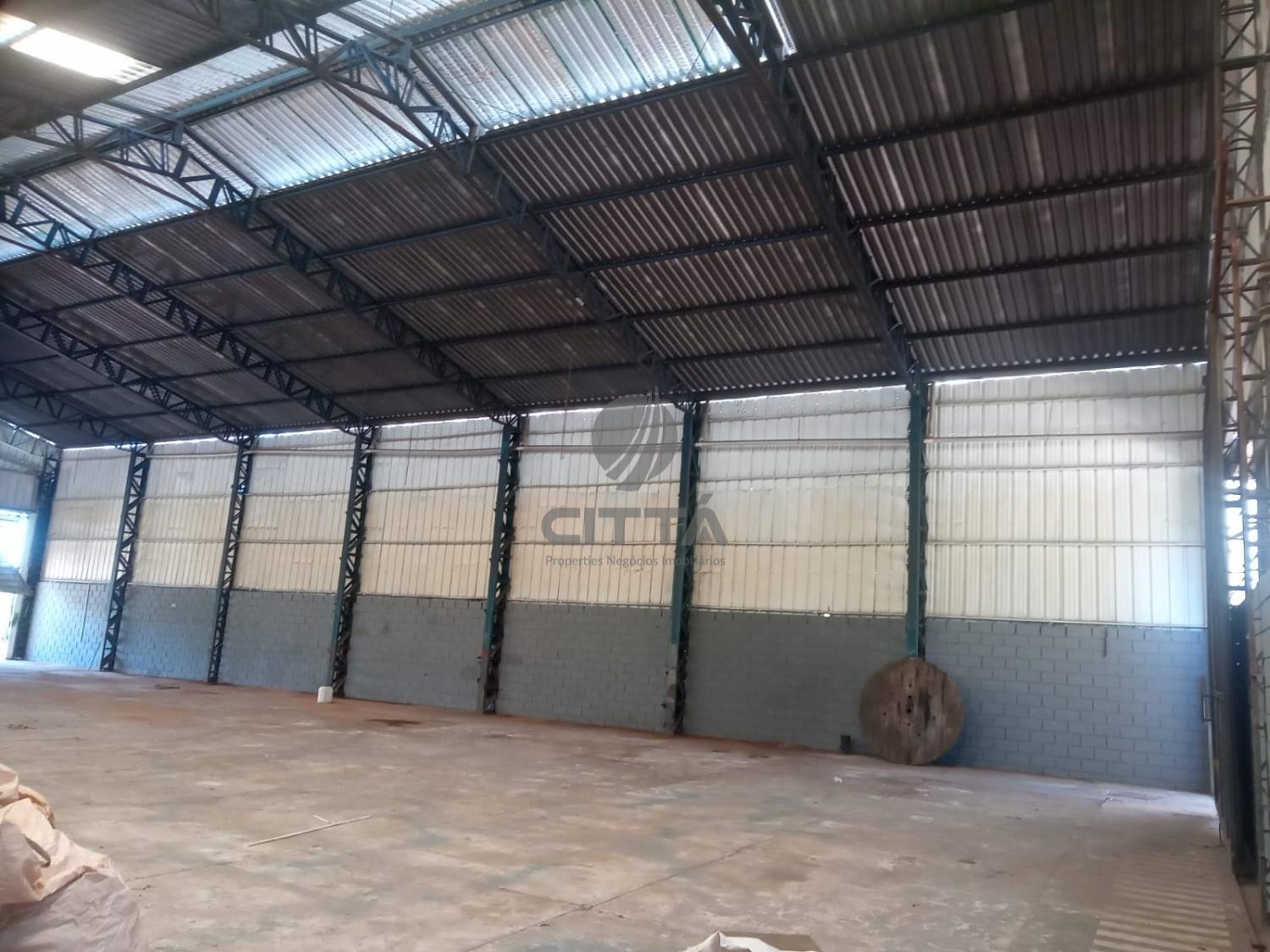 Está distribuído em escritório, refeitório, vestiário feminino e masculino, doca entrada de carreta, piso de tráfego pesado, poço artesiano, está todo cercado de alambrado.