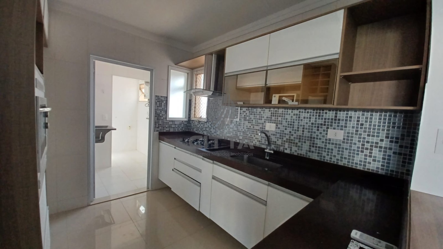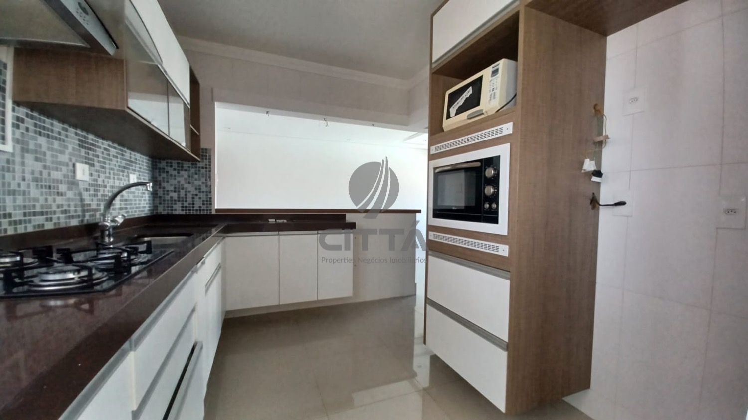 - cozinha com fogão cooktop, forno e microondas,