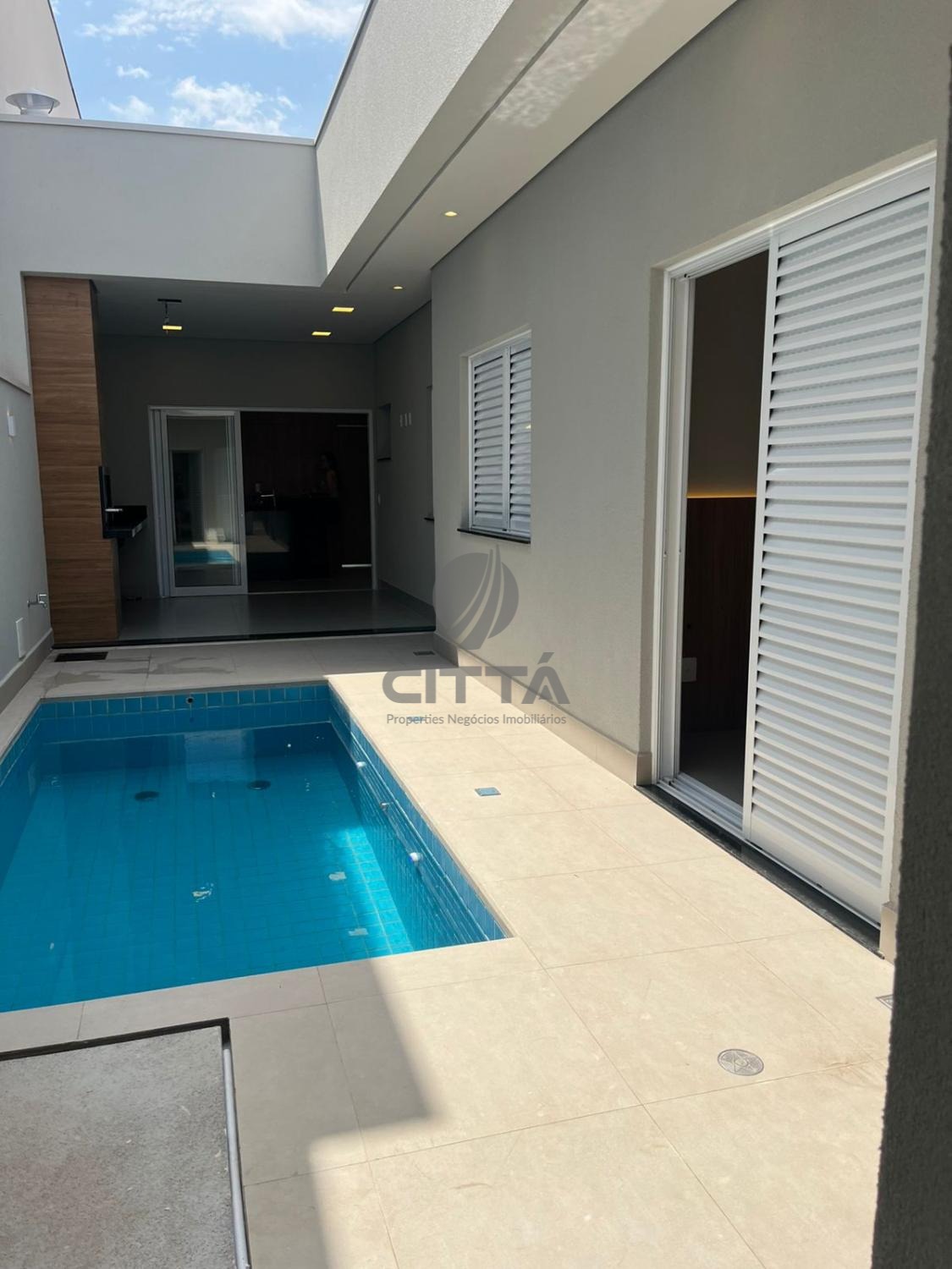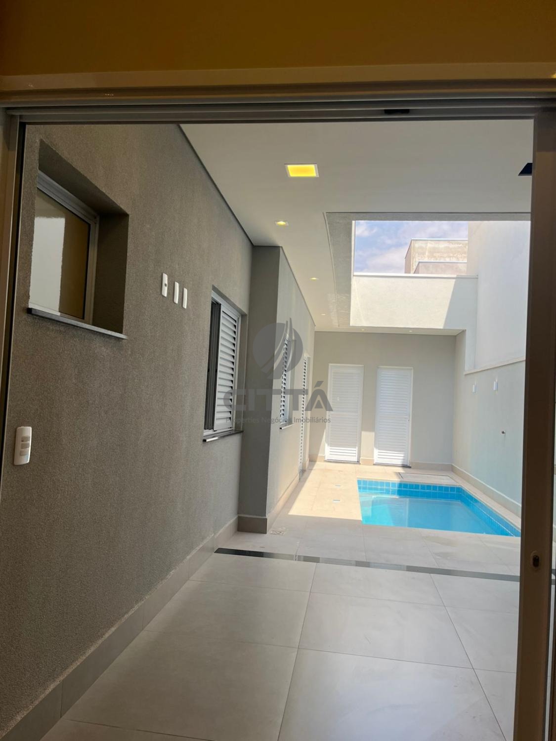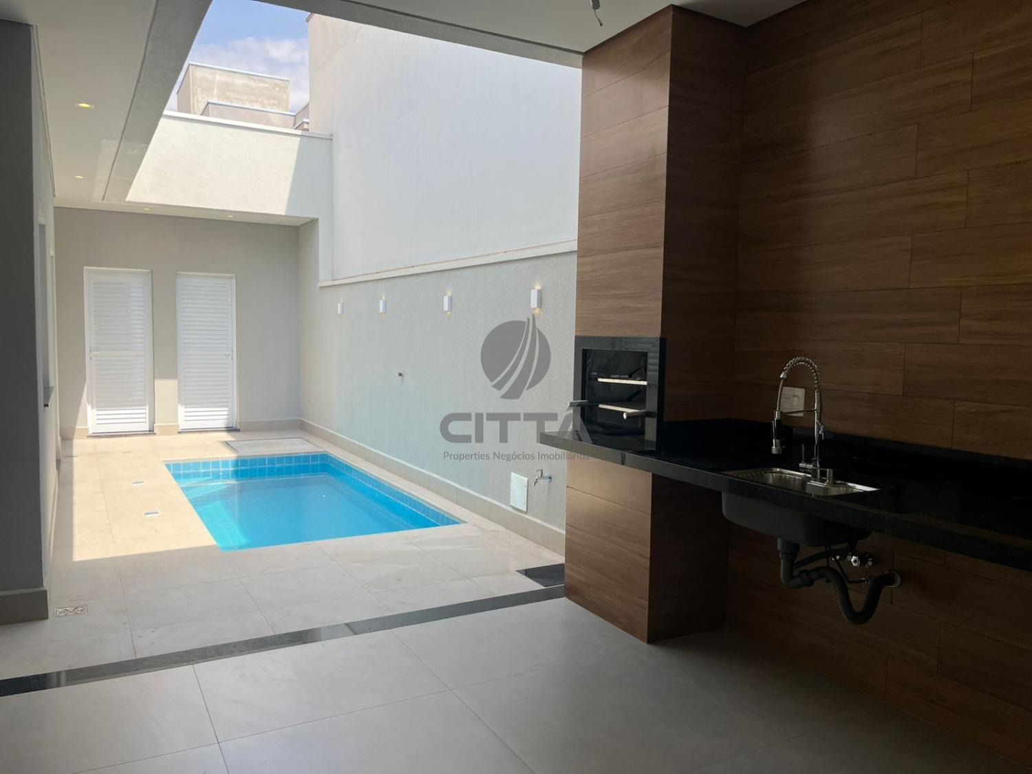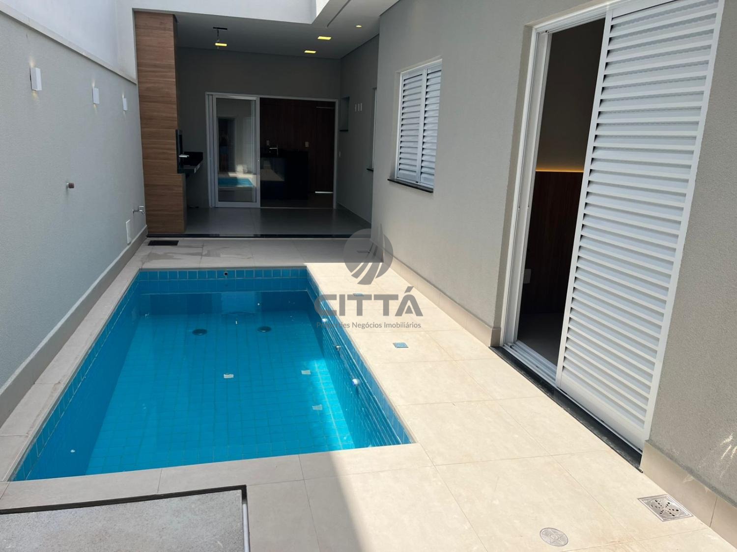A casa possui sala de estar, sala de jantar, pé direito duplo, banheiro exclusivo para o espaço Gourmet, área de serviço com tanque e armário, piscina de alvenaria, piso todo em porcelanato polido (Portinari Retificado).