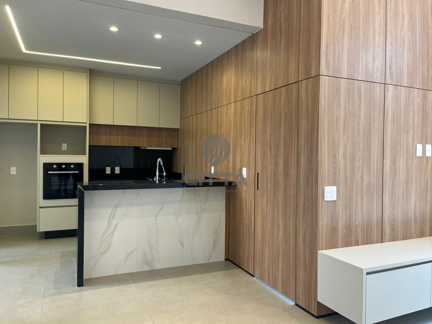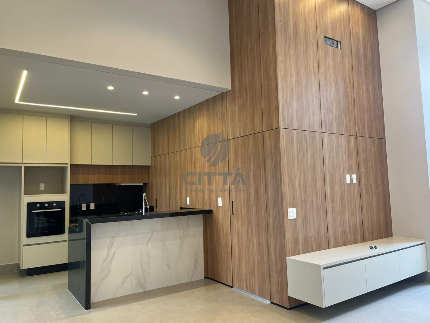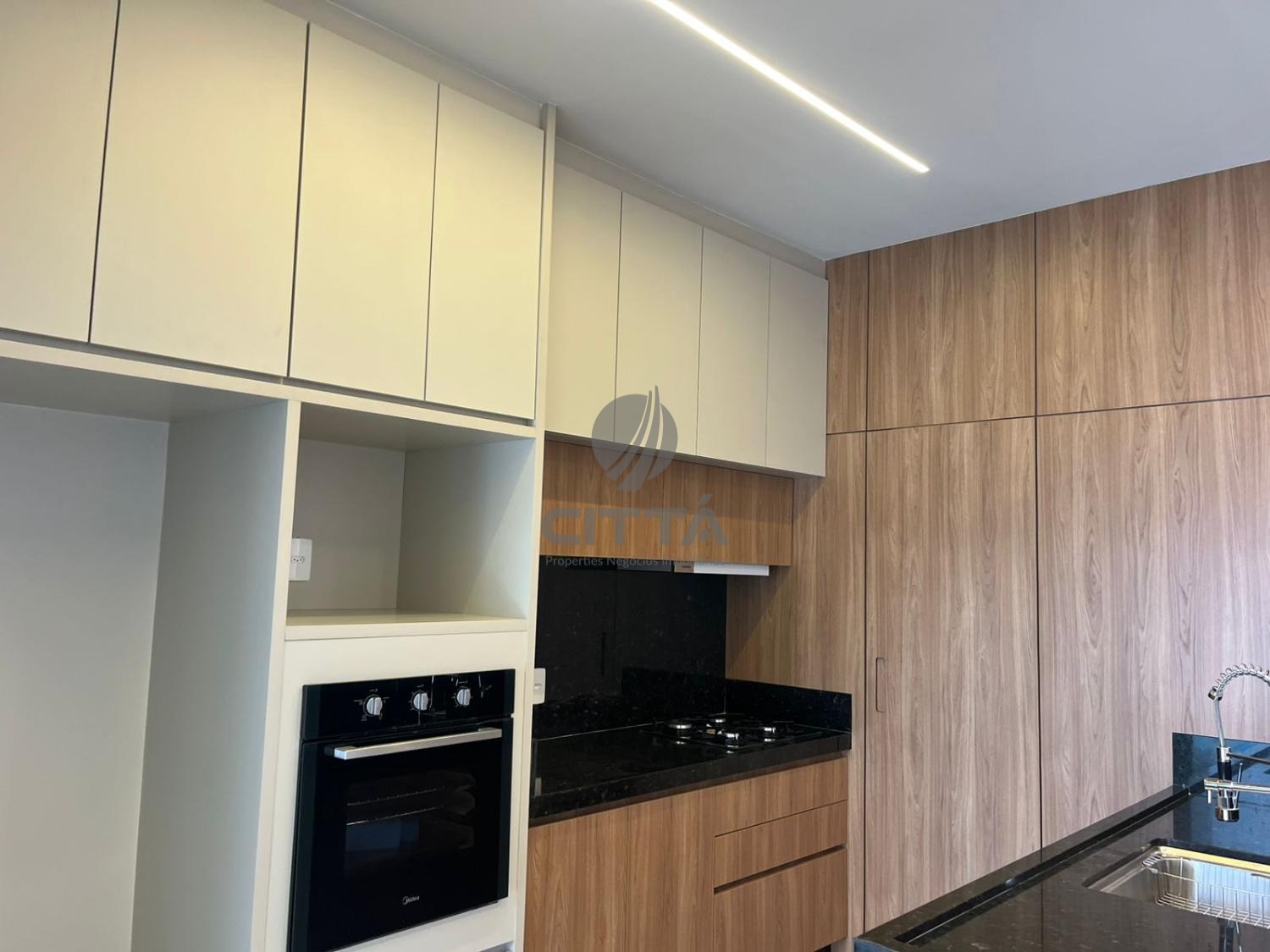 O escritório e a cozinha possuem móveis planejados, a cozinha possui forno elétrico, depurador e Cooktop.