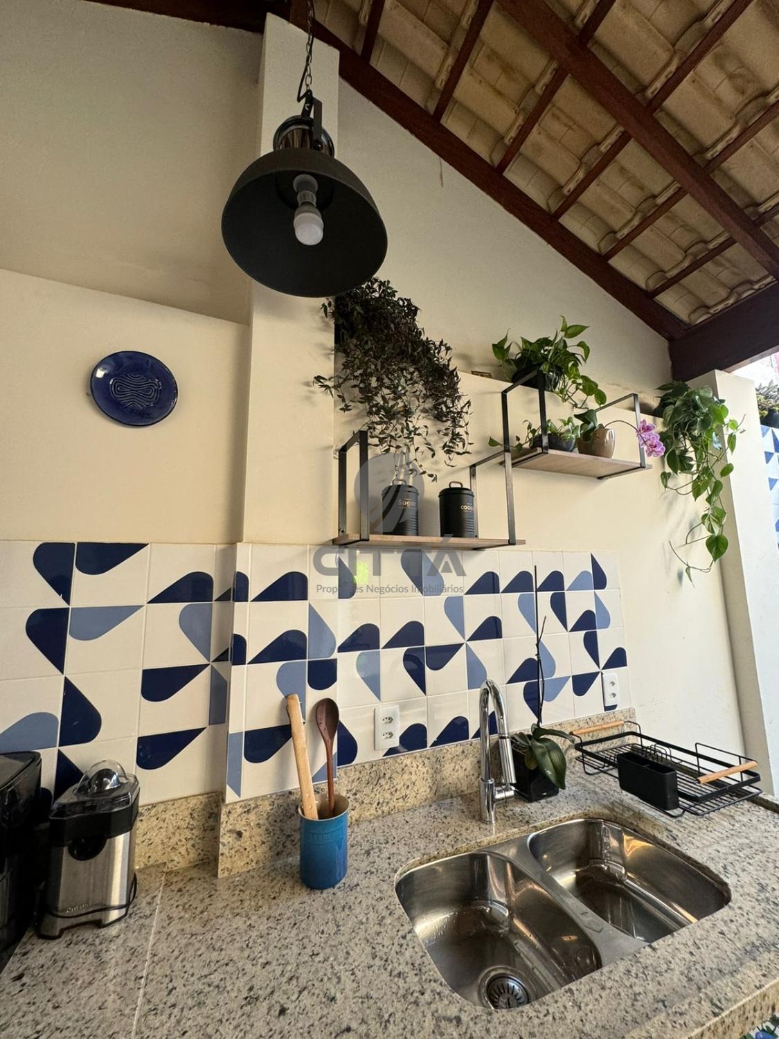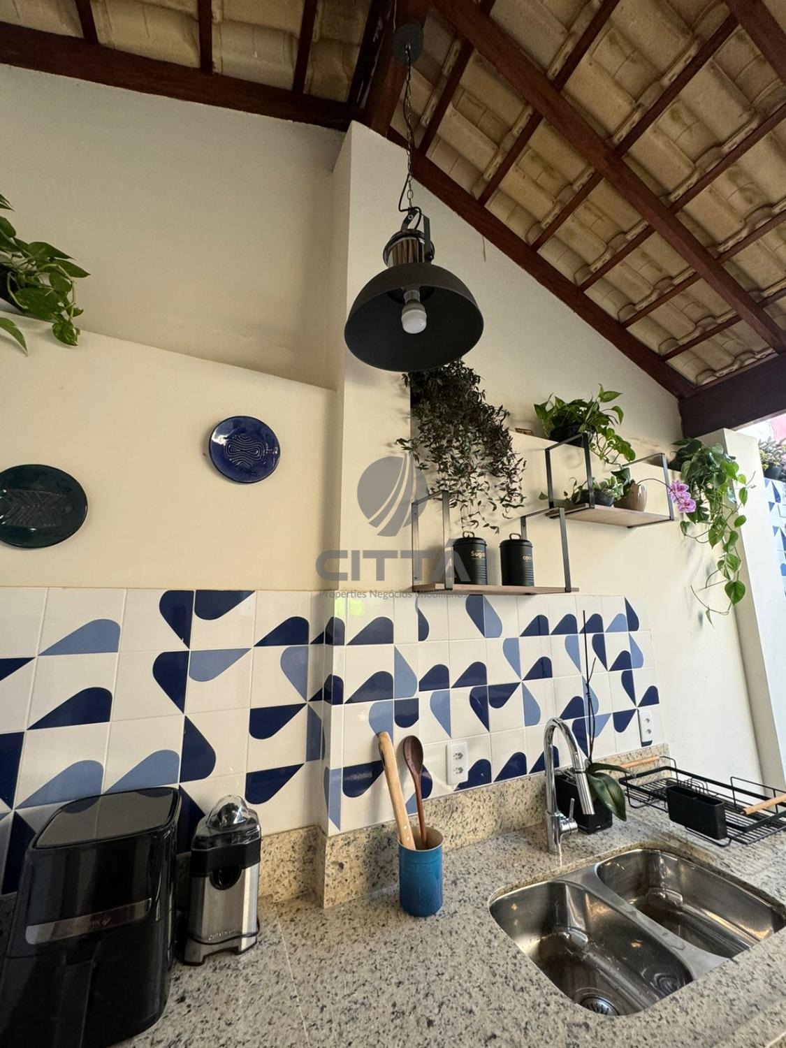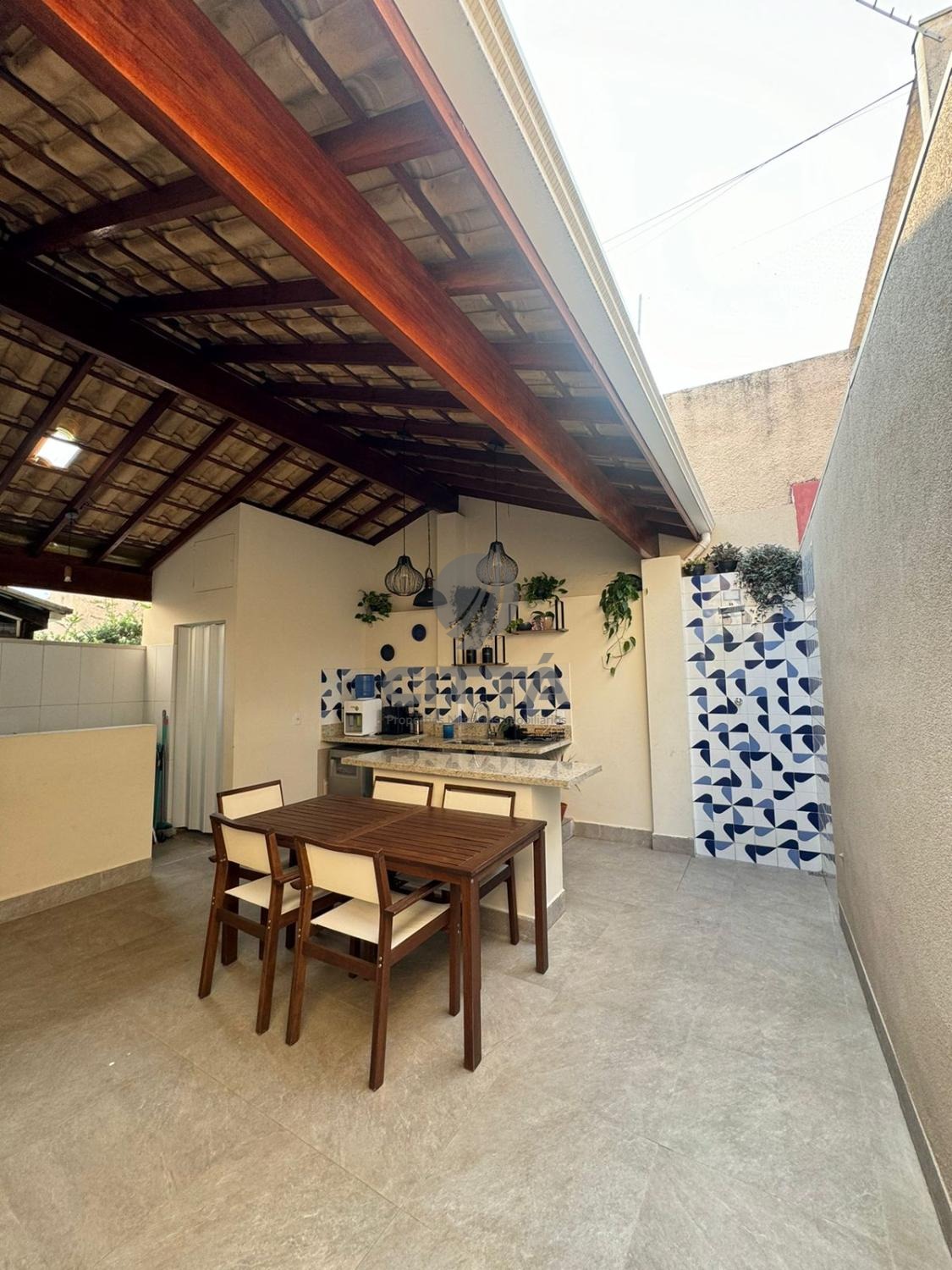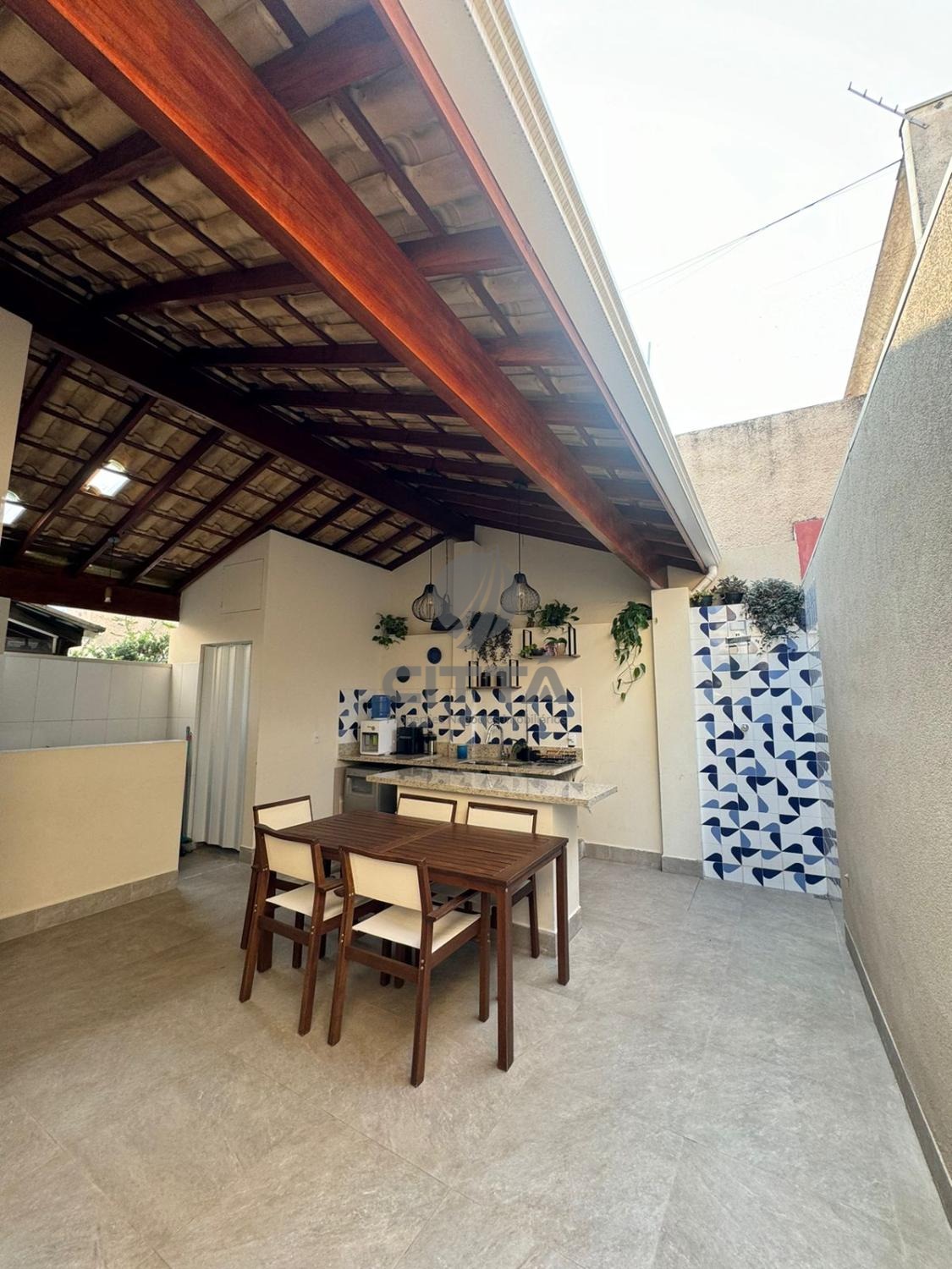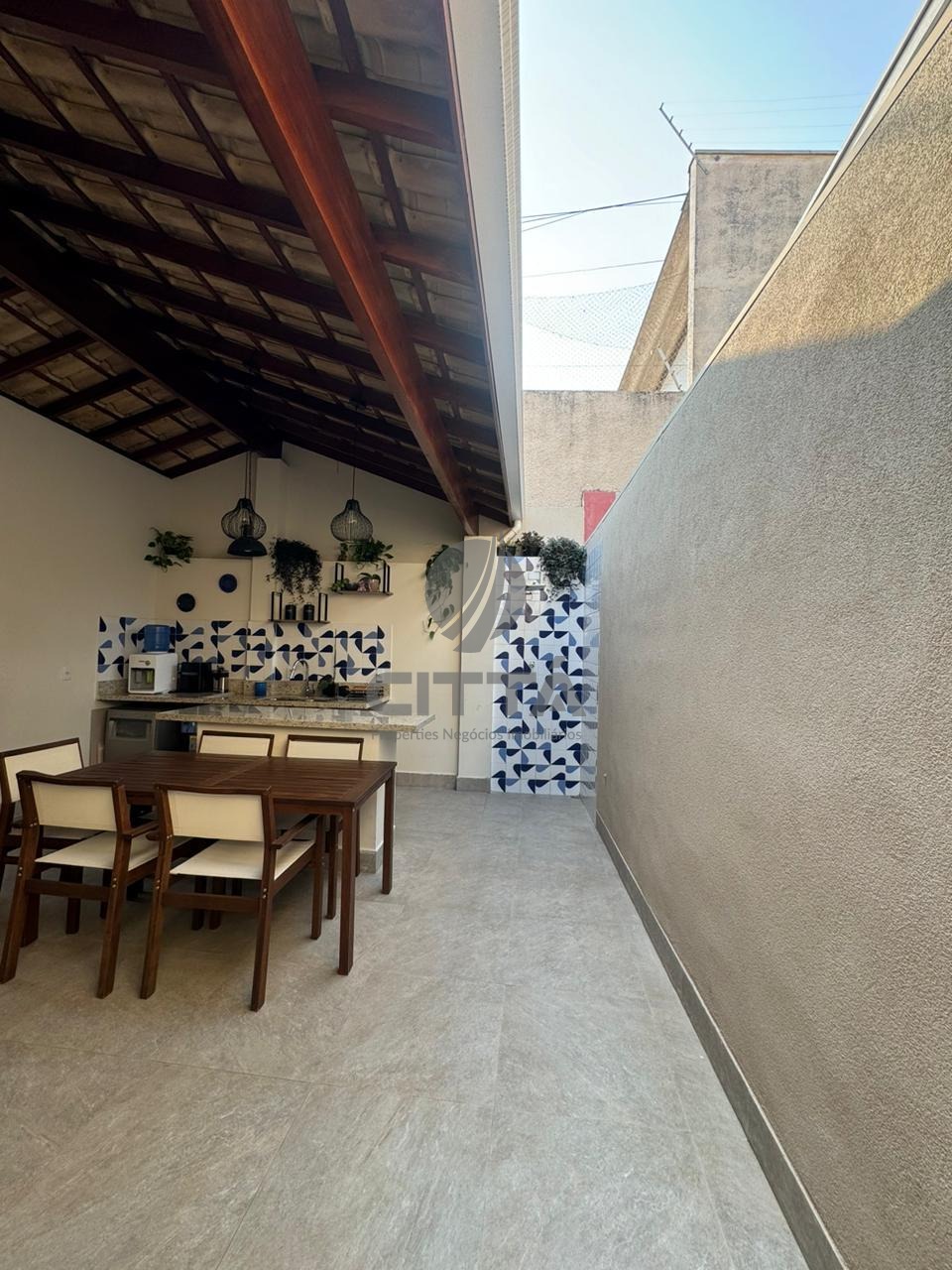 Sala ampla com cozinha, lavabo, quintal e área de serviço.