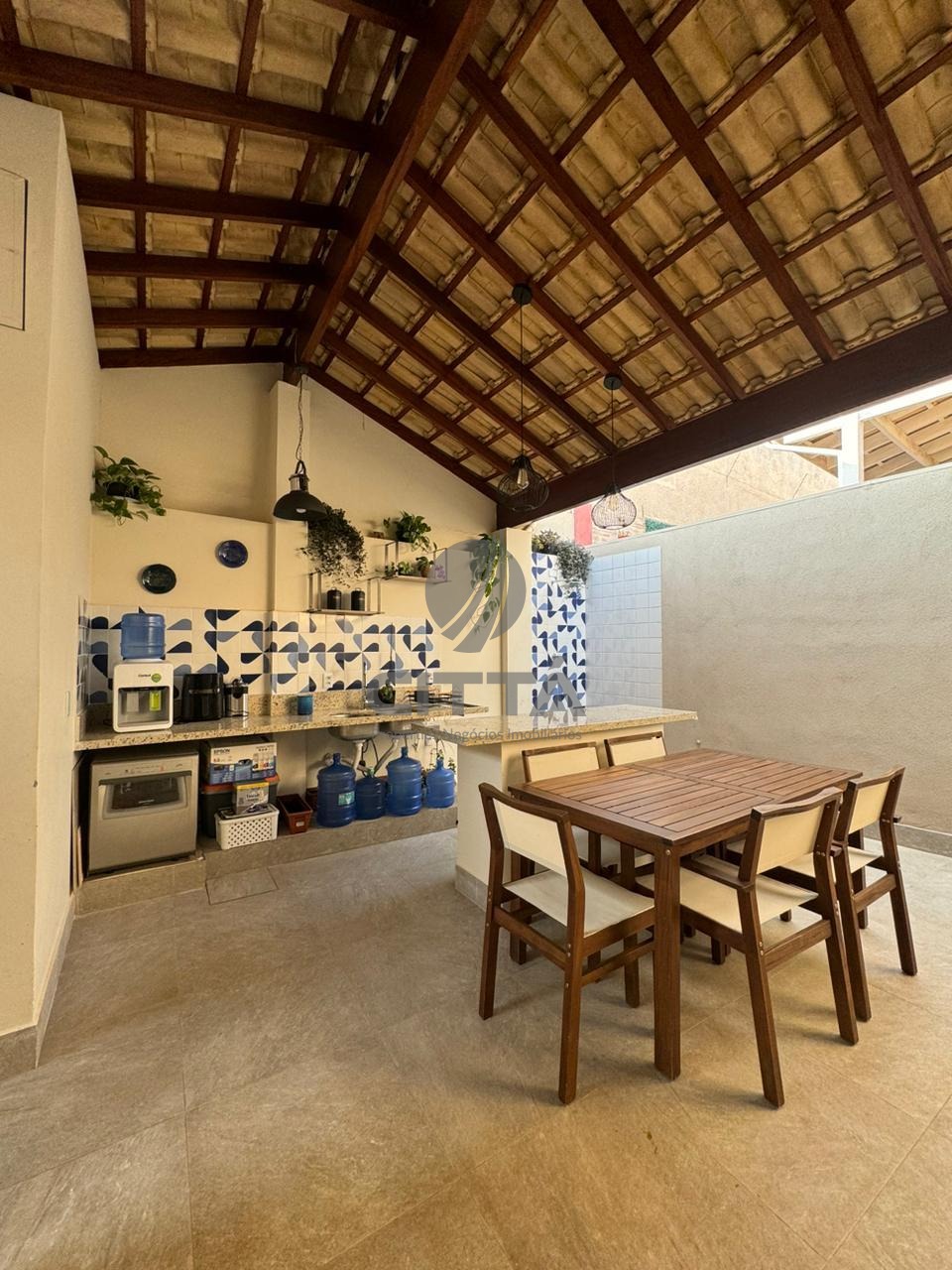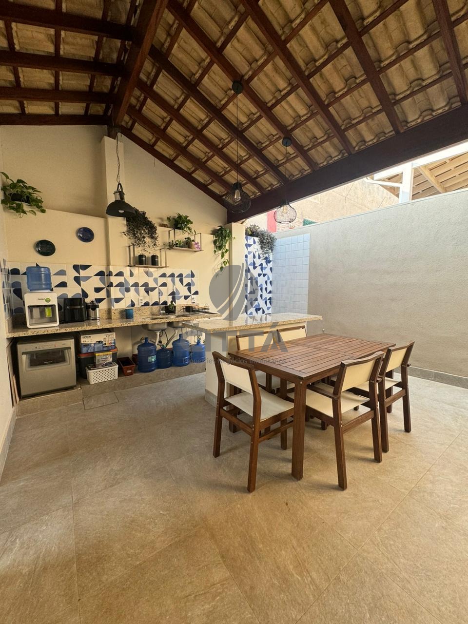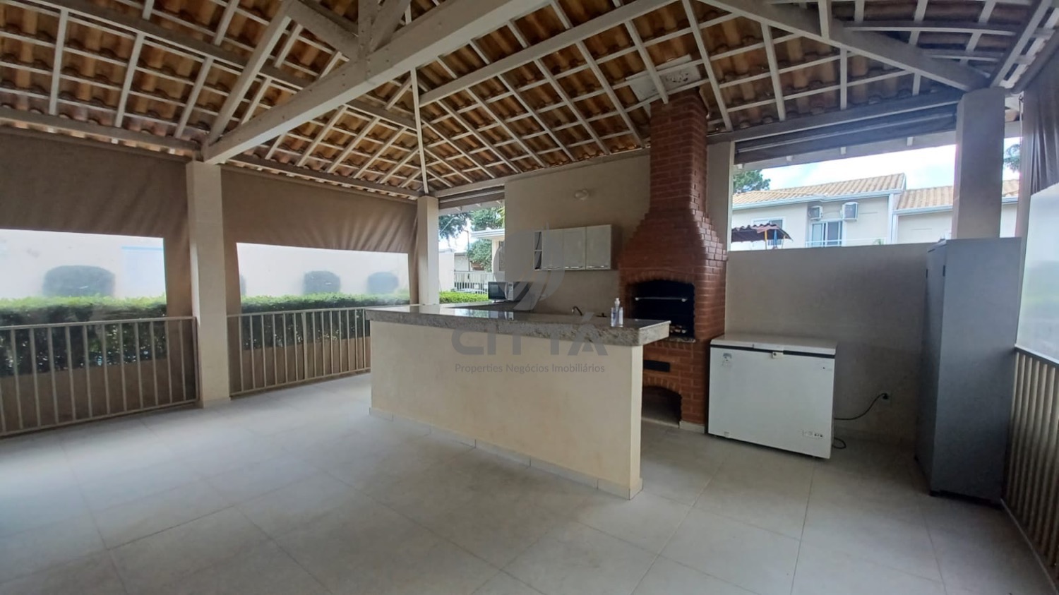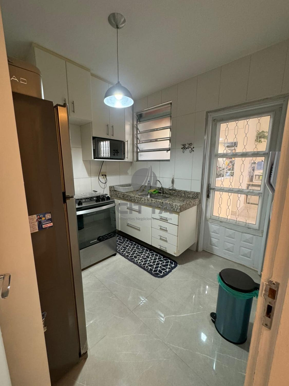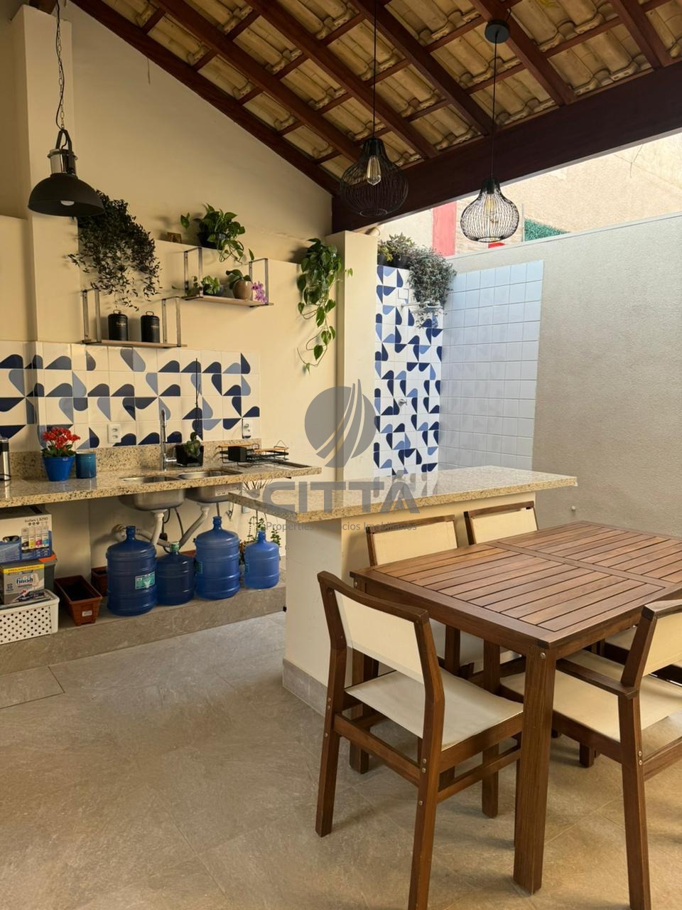 Sala ampla com cozinha, lavabo, quintal e área de serviço.