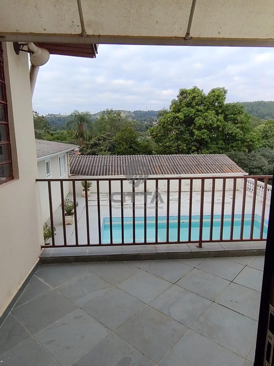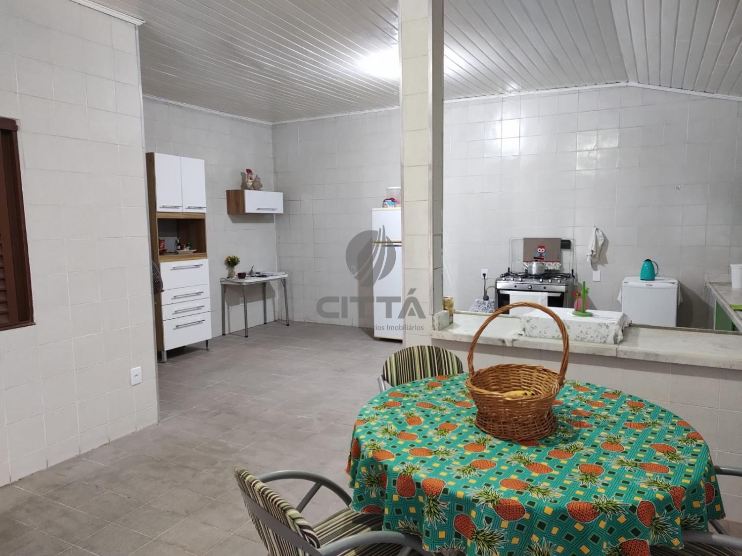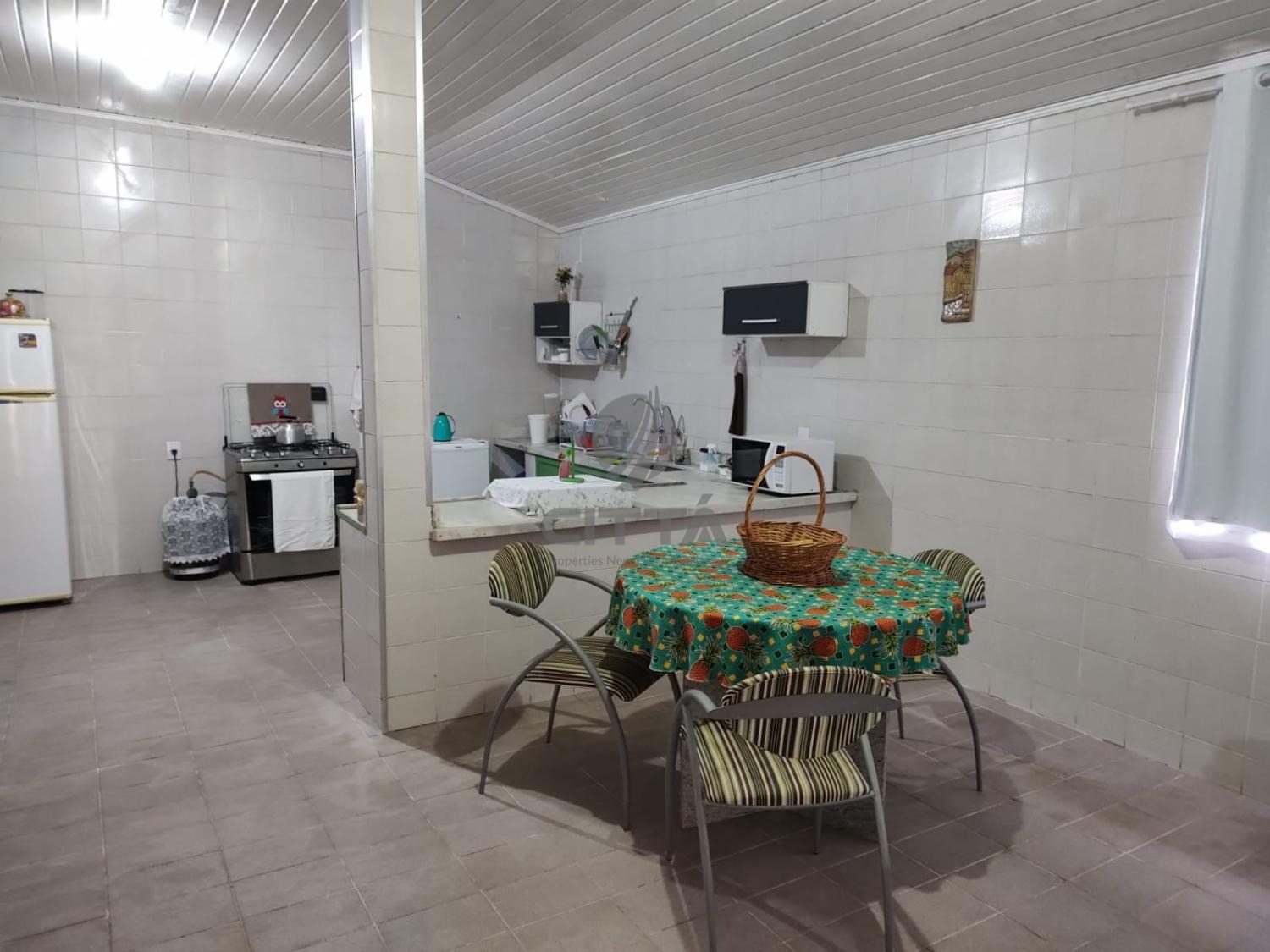 A casa à frente a piscina possui 1 sala cozinha com armários, banheiro social e 1 dormitório. "Casa do Caseiro" com 2 dormitórios, banheiro social, 1 sala e cozinha com armários.