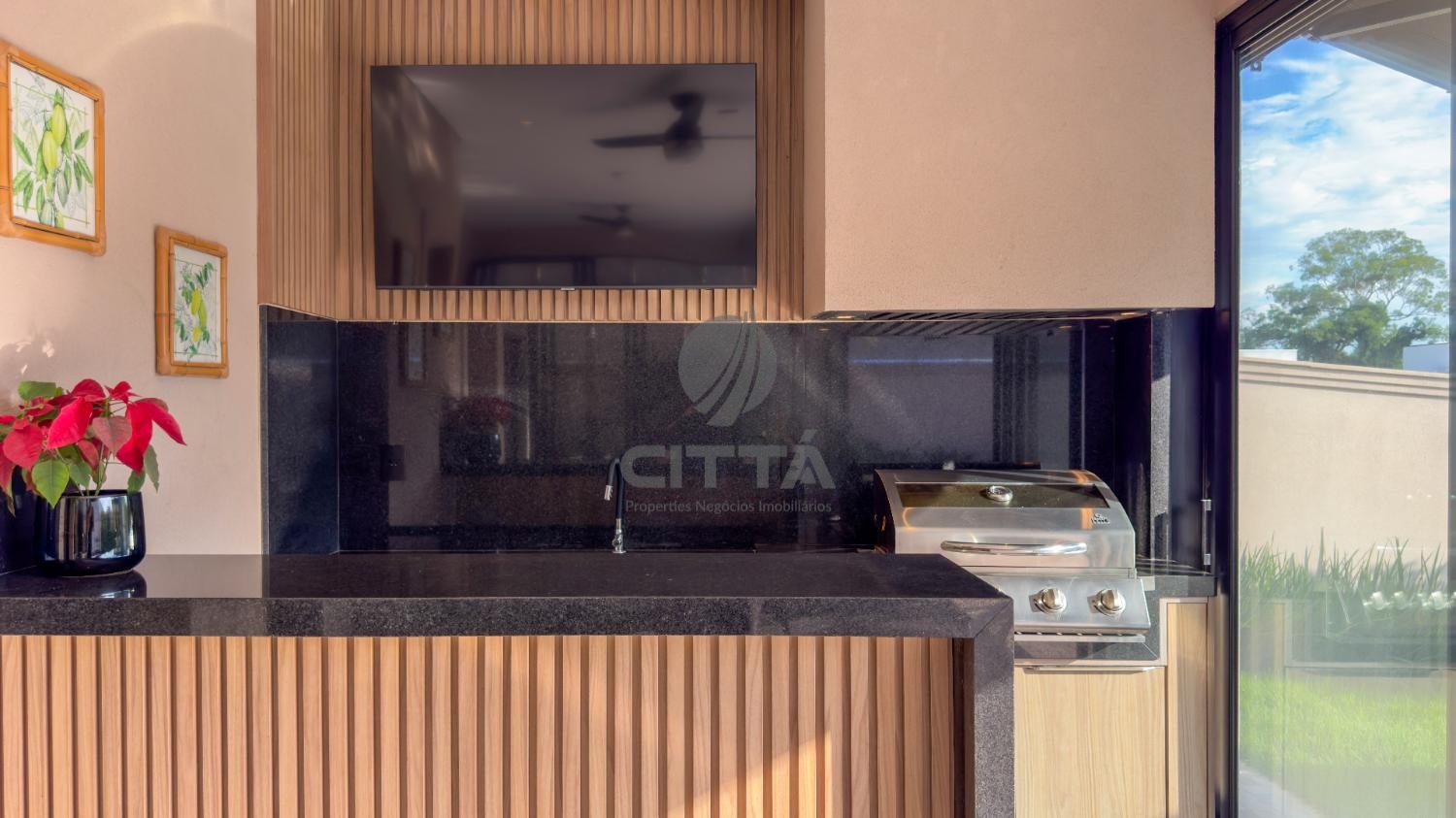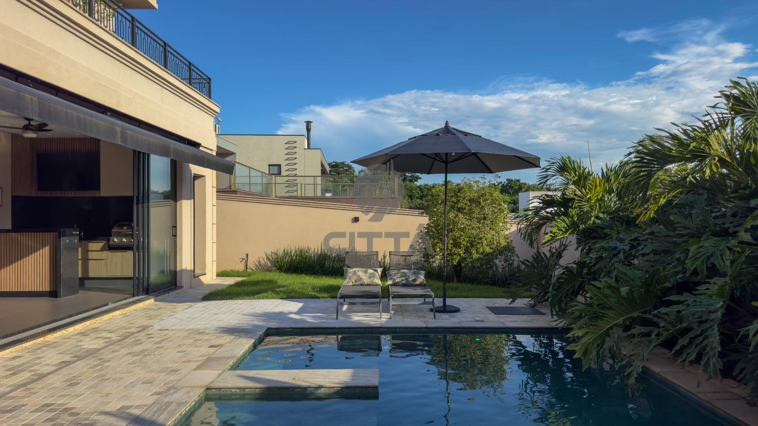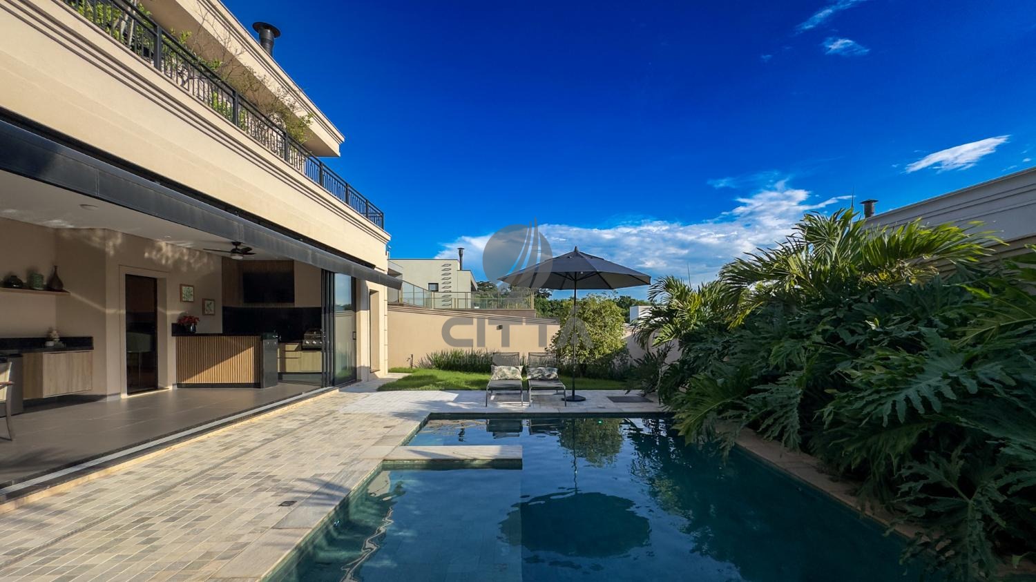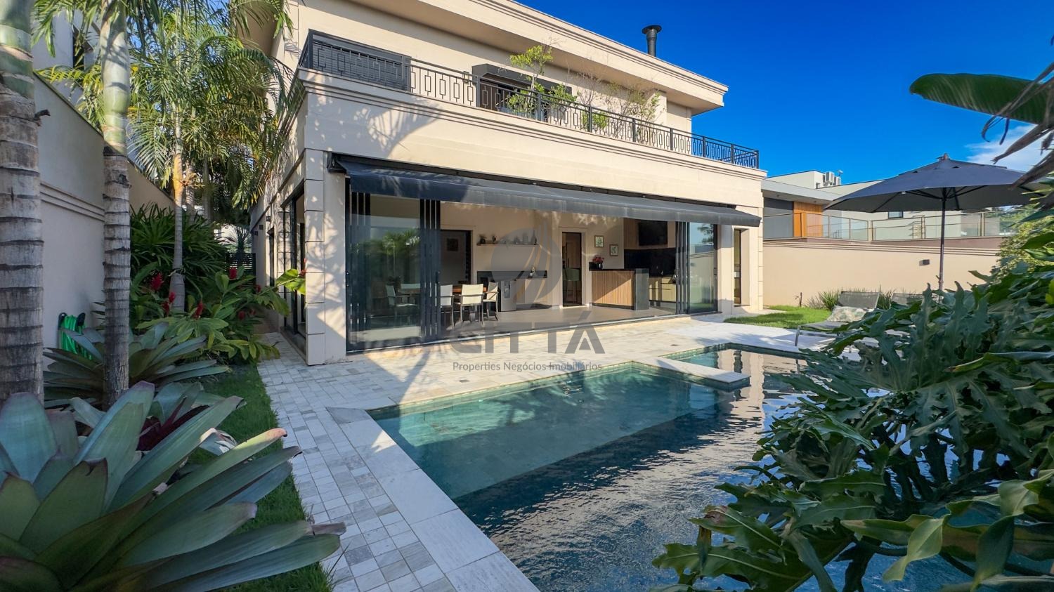A área gourmet oferece churrasqueira e piscina, complementada por paisagismo de excelente qualidade.
