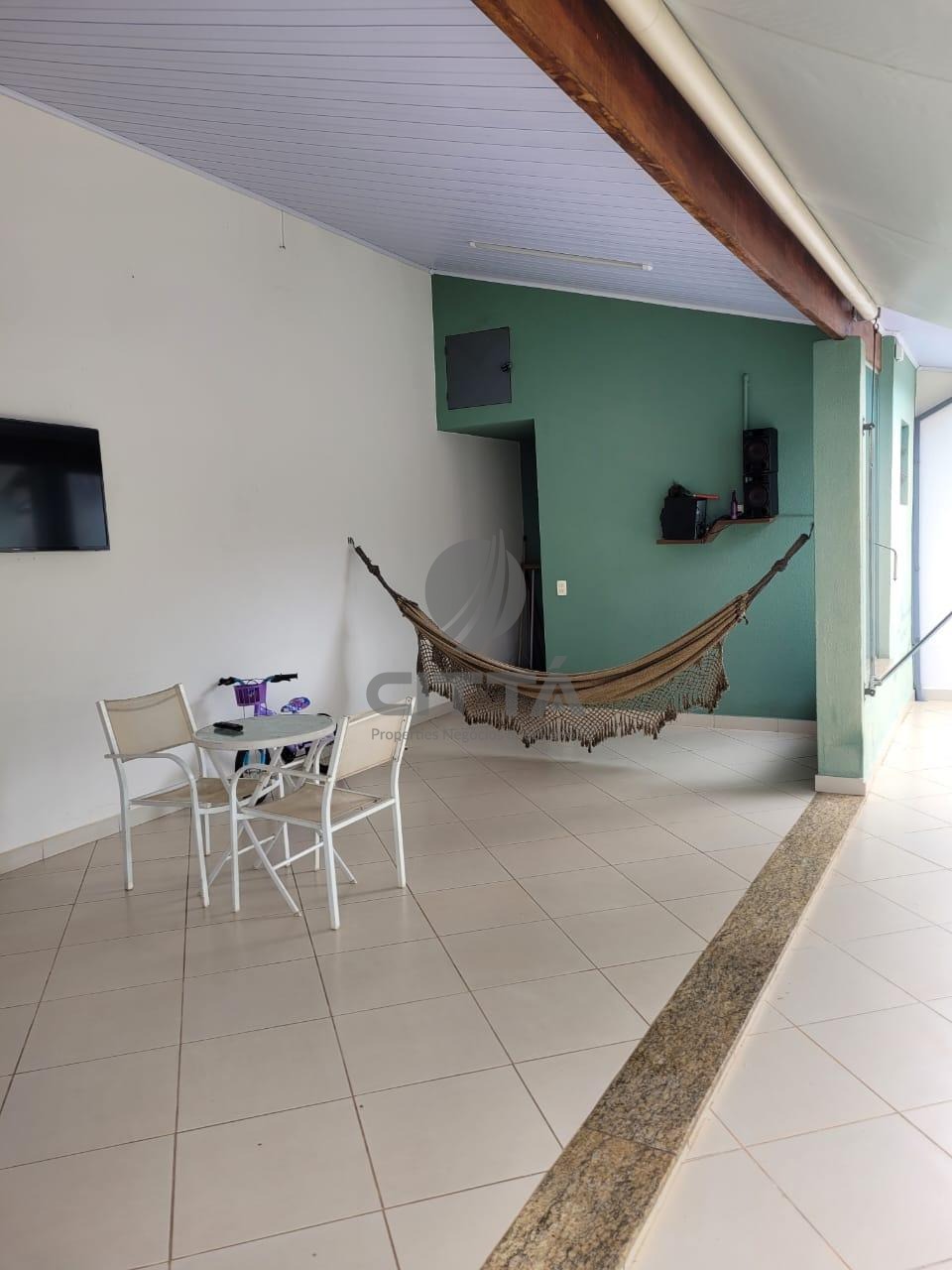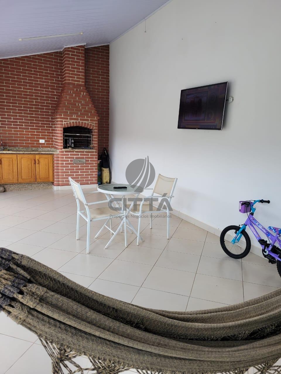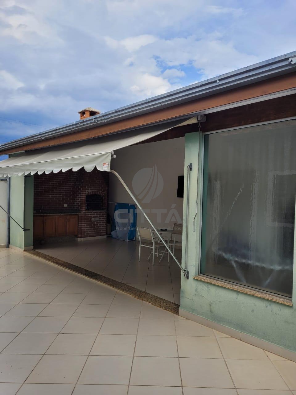 Uma espaçosa edícula com churrasqueira, fechamento de pia, área T.V, banheiro e toldo.