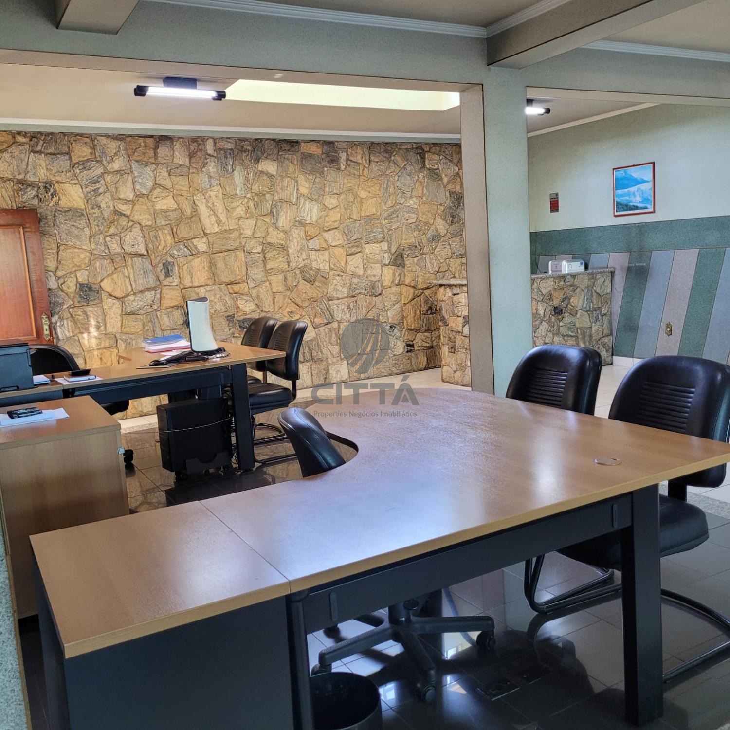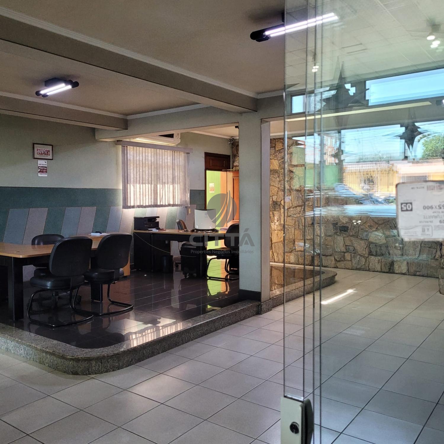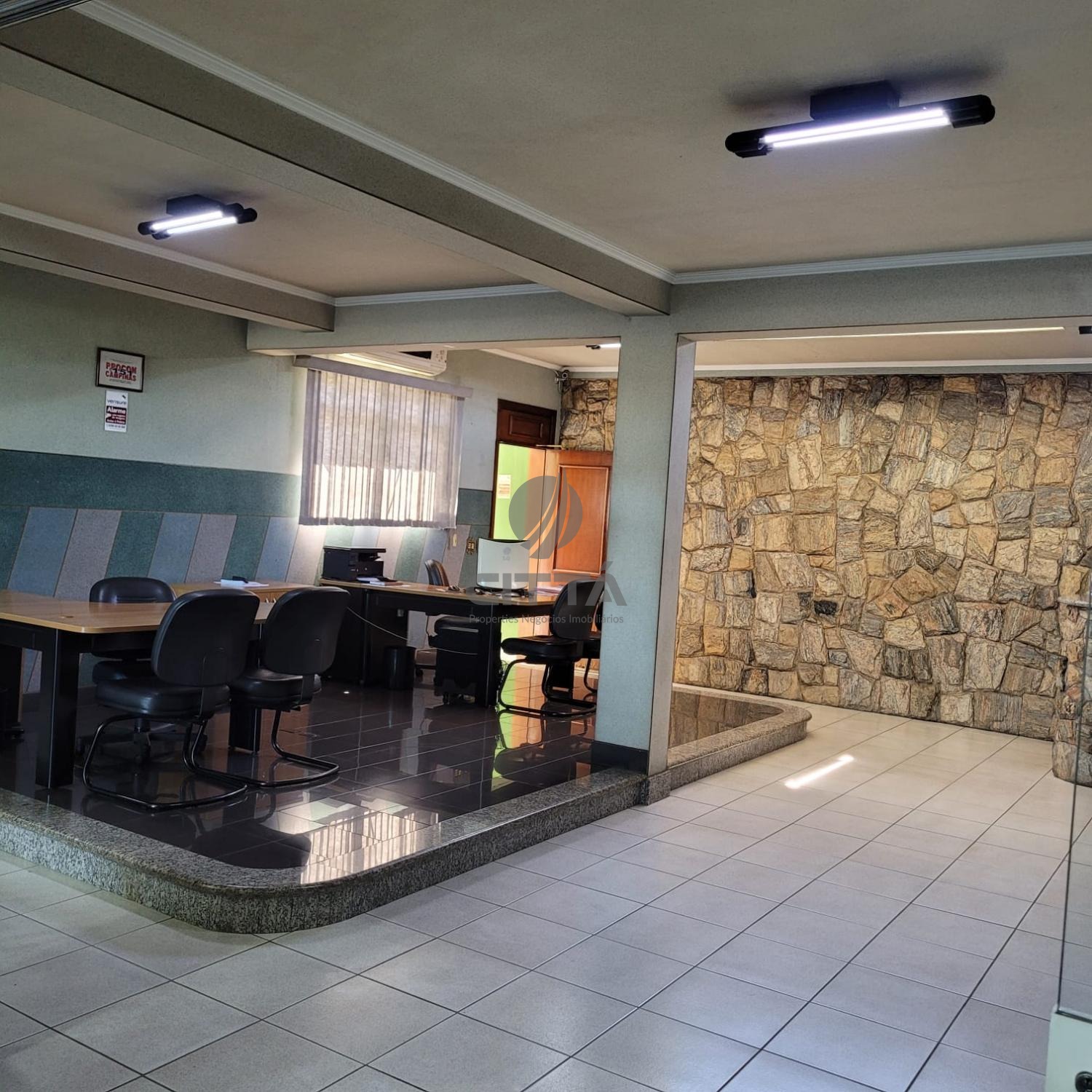 Área administrativa integrada, com recepção e escritório independente
